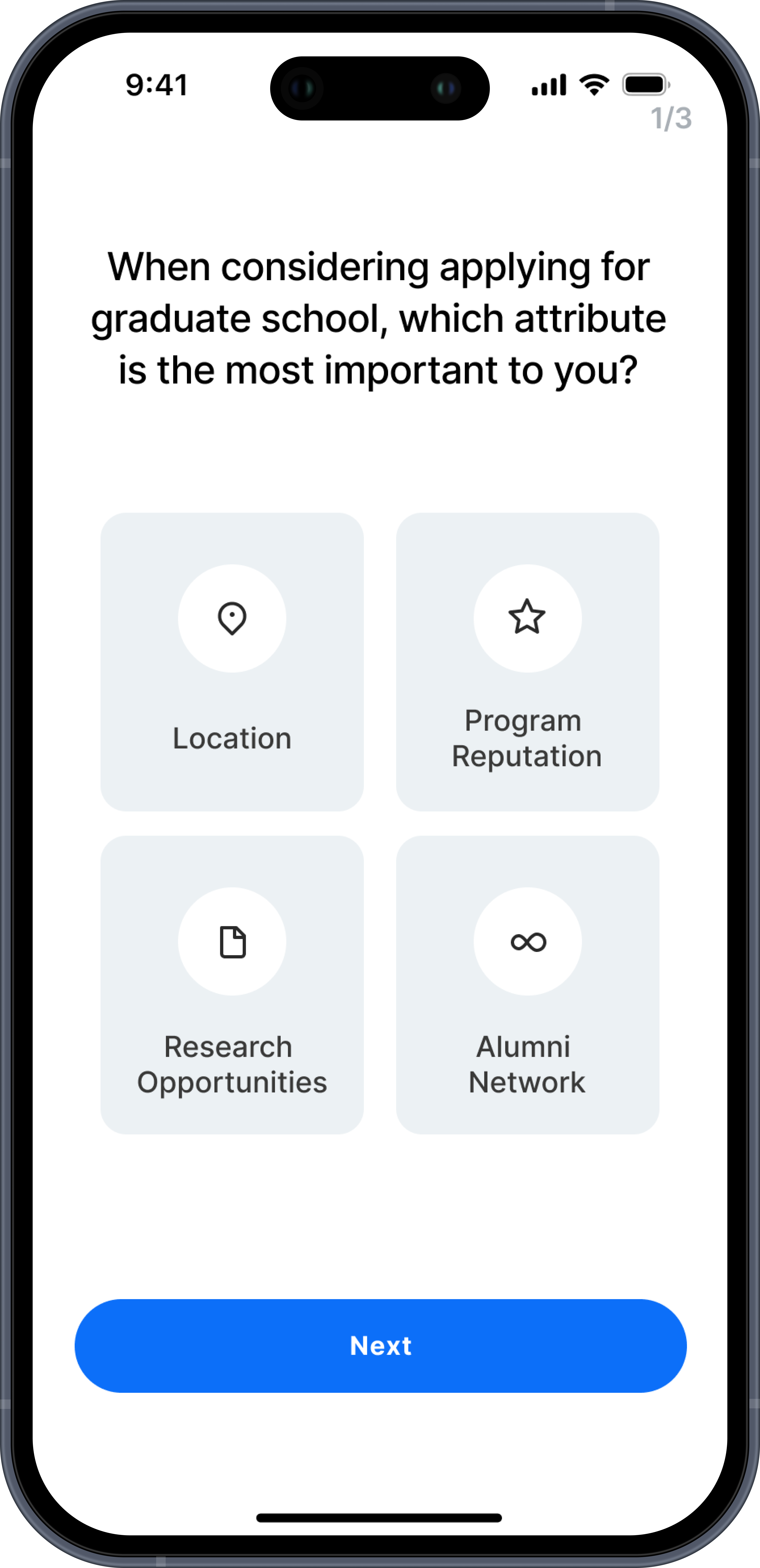 With the identified insights, I conducted primary user research, which included a survey of 20 participants and in-depth interviews with three individuals lasting 45 minutes each. This research uncovered several key insights into how people select graduate programs: