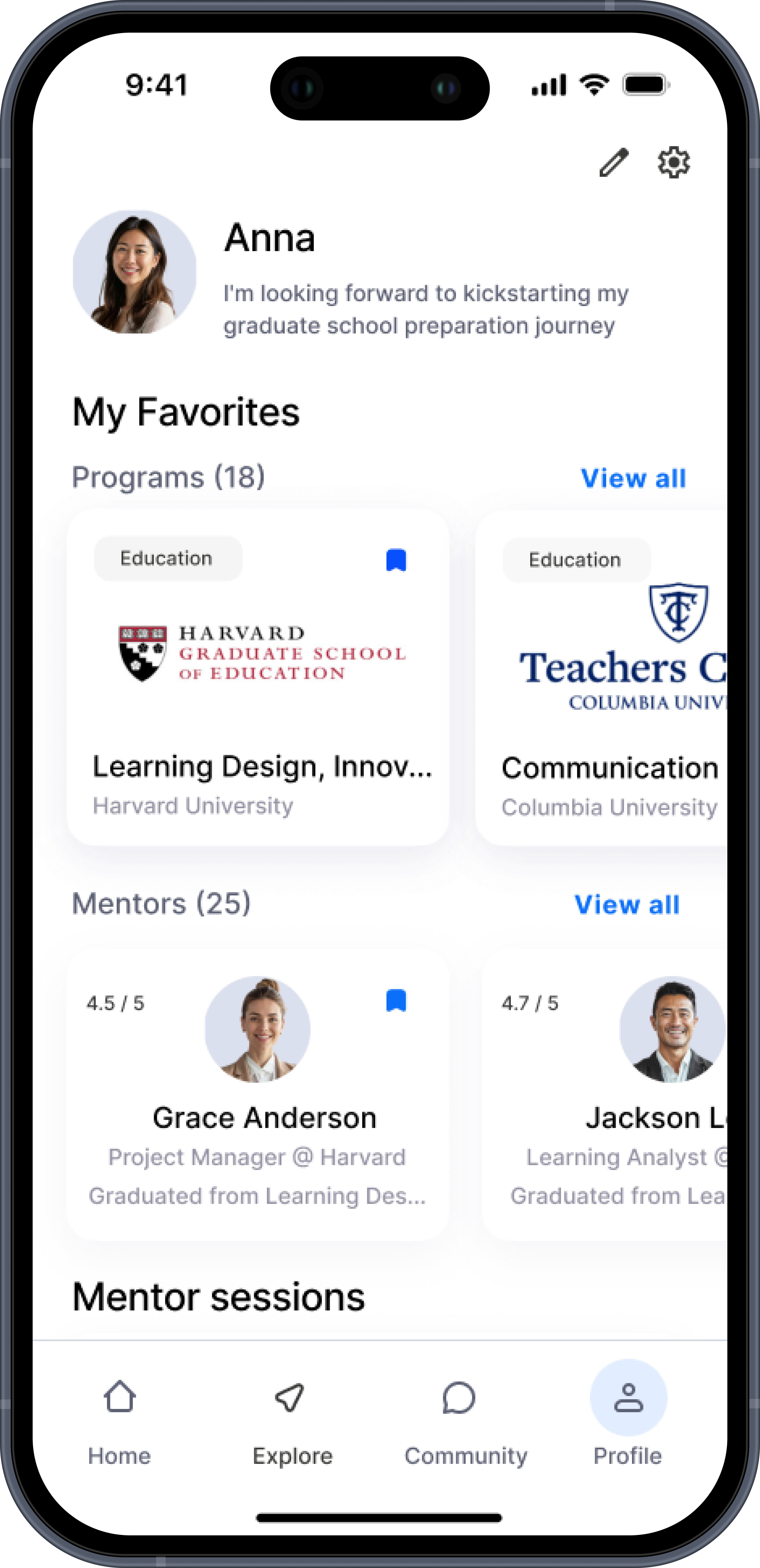 With the identified key features and problem statement, I created the information architecture to organize the content hierarchy and navigation structure through four main sections: Home, Explore, Community, and Profile. Then, I began to visualize how the content should be laid out on the screen to connect users with the features and functionalities designed to support their educational pursuits.